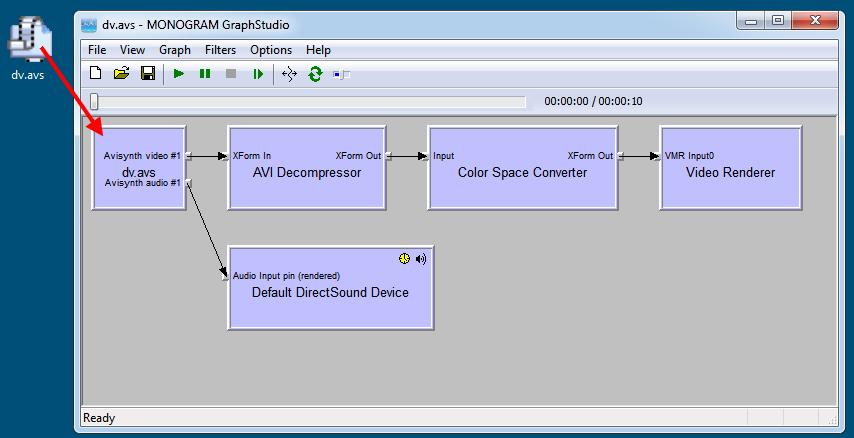 ok, here is my issue with ge. i am trying to connect an avisynth script (video.avs -> ffdshow video decoder) but they won't connect.