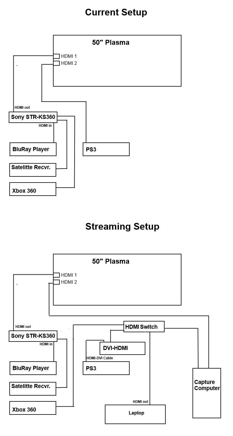 Maybe I'm asking the wrong question here, How would you set it up? spending as little as possible on only what you NEEDED to achieve the goal of streaming gameplay from xbox and ps3 (not at the same time). not to mention having the option to stream pc gaming from my laptop also. -
