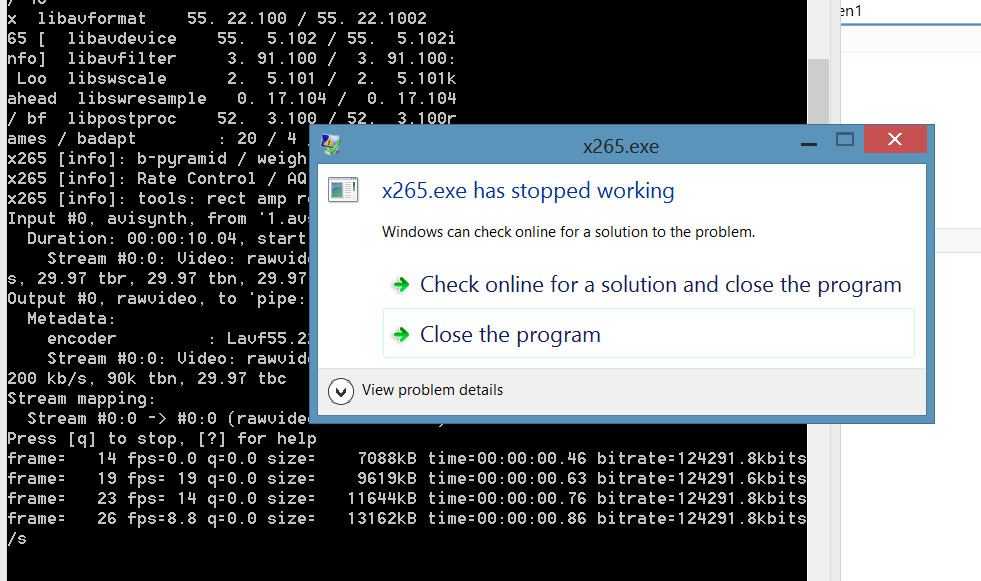 Hi everybody. Help please, trying encoding but start from version 0.7 x265 stoped encoding. Try with ffmpeg pipe to x265 versions took from here x265.ru and try all versions that works on my system Windows 8 32bit. From here http://chromashift.org/x265_builds/ http://builds.x265.eu/ commandline wrote that this version of OS don't accepted. What I can do?