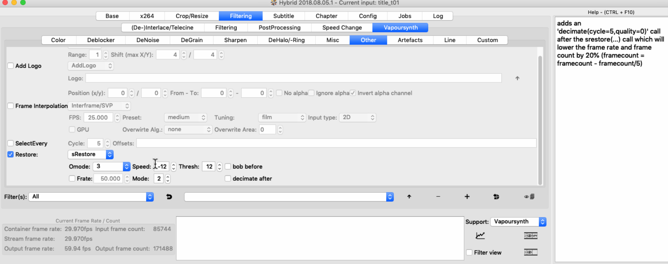 SRestore isn't the appropriate plugin for He-Man and the Masters of the Universe. I once did all episodes of She-Ra season 1. You can use RePal() as that is the method that the ... at BCI Eclipse used to convert from 25fps to 29.97. RePal will still produce artifacts. The best was is to do it manually. Here is a script for the episode "The Christmas Special" BCI version: