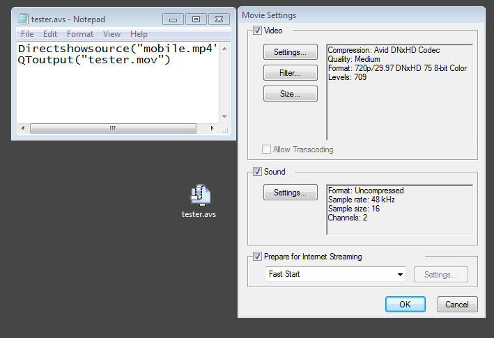 6. As many editors don't support AVS scripts, you may find it easier to use a program like VirtualDub open the script and output uncompressed or losslessly compressed AVI. Then use another program to convert AVI to MOV.