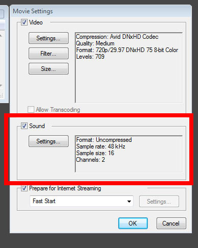 When the movie settings dialogue box pops up you have to tick video and sound. With DNxHD choose 48kHz, 16 bit, 2ch