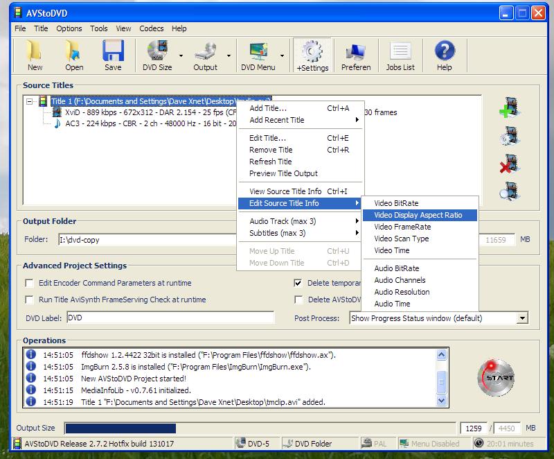 3. There are now two methods to change the DAR to 16:9 but as far as I see they both do the same. Right-click in the main window just below where your video's details now show. Select 'Edit Title' and the 'video tab'. Clear the 'Auto Video Setup' checkbox and change the Video Aspect Ratio to 16:9.