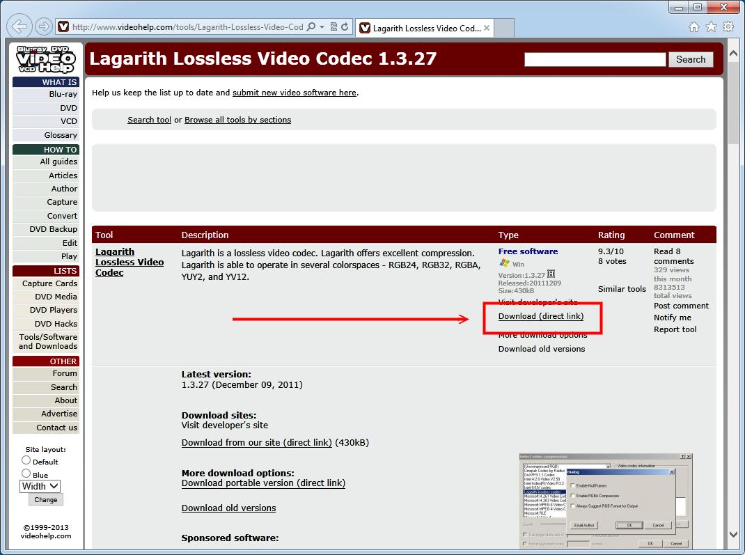 Just went to the Lagarith link you gave .... across top of page is a big green 'Download' button .... it does not say what it is for ... but when you download it is not Lagarith, it is 'Ultimate codec pack'