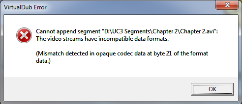 I can happily combine that broken video with the other 50 but I cannot seek that portion in VirtualDub (well I can but like the error says it's slow). I thought to just recompress it using Lagarith again to a playable and seekable file but now that gives me the following error when I append that fixed video 1 to any of the 2-50 videos: