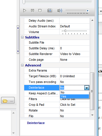 Ok, I tried "deinterlace=yes". Convertion stops with error: