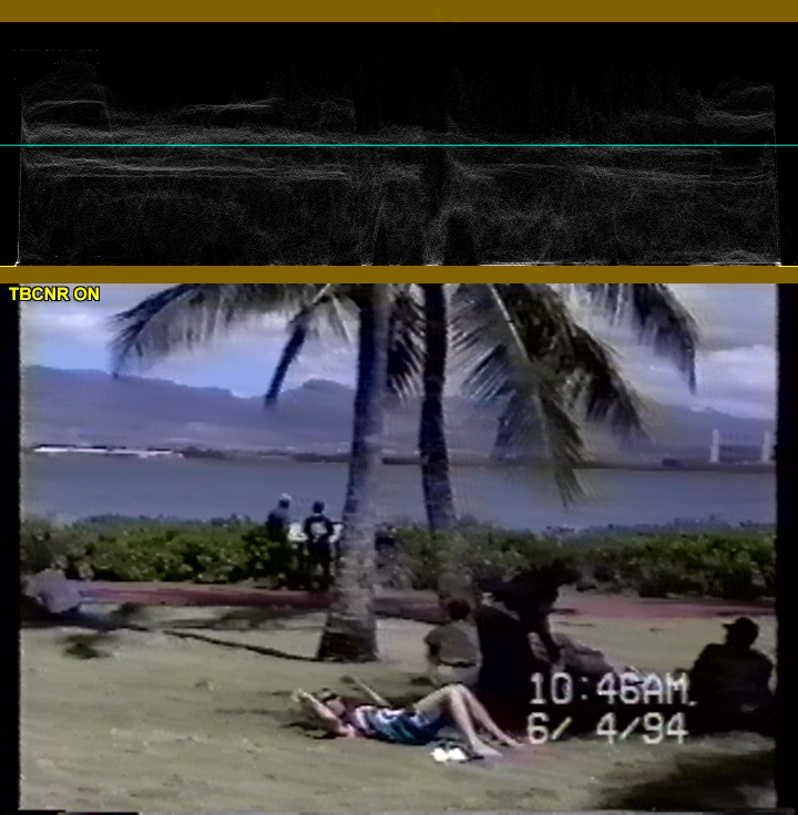 The TBC is definitely working. It's especially noticeable at the black borders. The ghosting in the video isn't caused by the NR circuit. It's there whether or not the function is enabled. The NR isn't so aggressive that it removes all the low contrast detail. Unless some other settings were changed, the TBC/NR filter is also increasing the gain (brighter picture, more contrast) and crushing super blacks.
