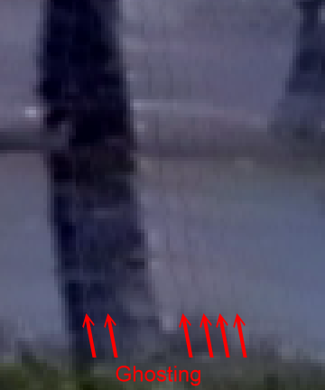 Notice those ghostly lines running parallel to the trunk of the tree? That's where the edge of the tree was in the frames before this one (the camera is panning). They are ghosts caused by a temporal noise reduction filter. But the capture made without the TBC/NR has the same ghosts so they weren't caused by the NR in the VCR.