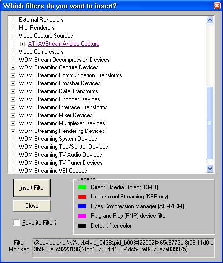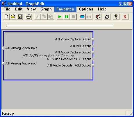 The proc amp is usually found in Video Capture Sources (VFW devices) or WDM Streaming Capture Devices (DirectShow devices). I think I've also seen it in WDM Streaming Crossbar Devices. In the above image you can see ATI AVStream Analog Capture, the device I'm using. Highlight the device and press the Insert Filter. You'll see the filter in the main GraphEdit window: