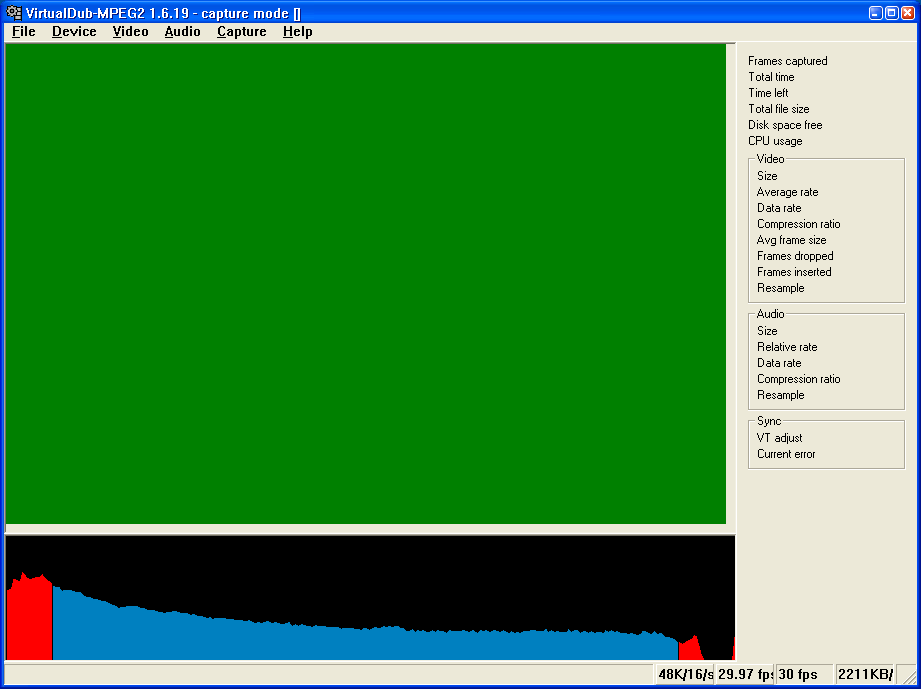 I decided to give GraphEdit a try. Not too tough. But, I only get two sliders, brightness and contrast. I assume that's because of my cheap capture device. Also, in VirtualDub I get a histogram black bar below the capture screen but no red/blue. Just black. And that is when I'm in the capture AVI mode. Am I doing something incorrectly?