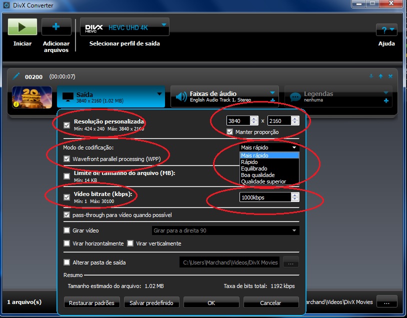 i decided to do a test encode using the 4k version as source and the latest divx convertor, i set wpp to on, audio to 192kb/s, i set the video resolution to 1920x848 in order to match the test encode's aspect ratio to the source's 2.25:1.