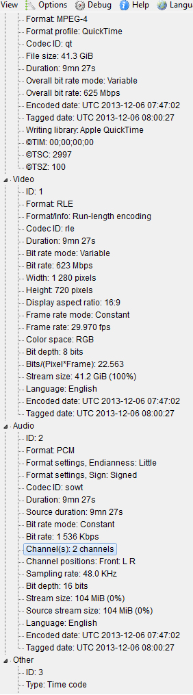 Stream #0:0(eng): Video: qtrle (rle / 0x20656C72), rgb24, 1280x720, 650641 kb/s, SAR 1280:1280 DAR 16:9, 29.97 fps, 29.97 tbr, 30k tbn, 30k tbc