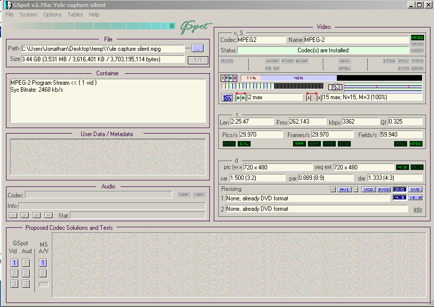 I've tried to post the mediainfo and gspot screen captures, but the forum keeps failing to let me post that.