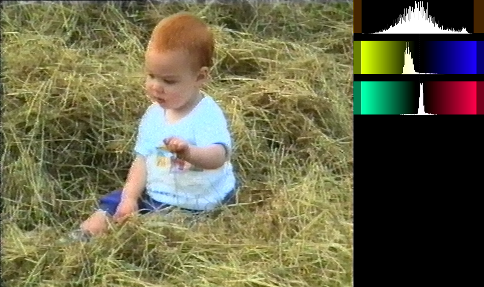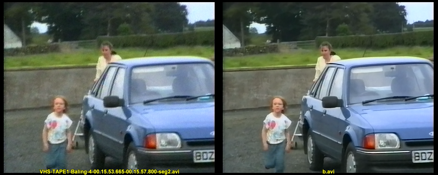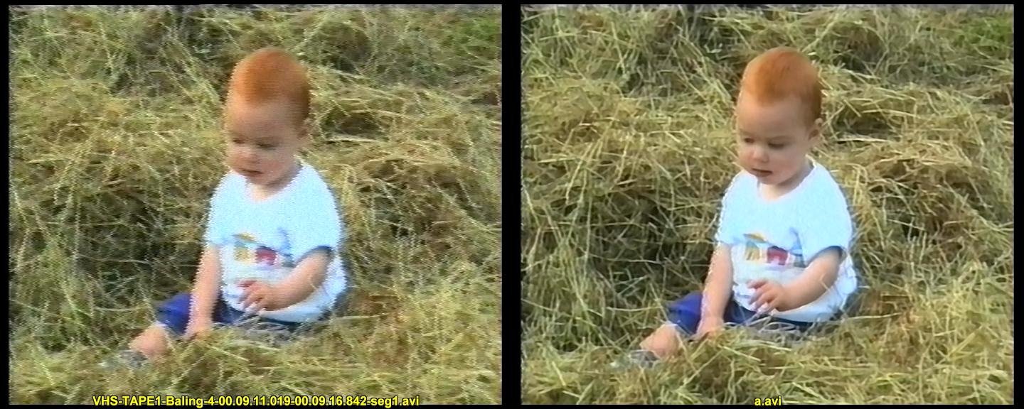 Filtering video 2 (just crop top changed):Code:video_org=AviSource("VHS-TAPE1-Baling-4-00.09.11.019-00.09.16.842-seg1.avi") # cropping crop_left=16 # | rimozione esatta delle bande nere sinistra, sopra, destra e del disturbo sotto crop_top=8 # | 720-(16+10)x576-(8+4)=694x564 crop_right=10 crop_bottom=4 video_org_crop=video_org.crop(crop_left,crop_top,-crop_right,-crop_bottom) ### de-interlacing deinterlaced=video_org_crop.AssumeTFF().QTGMC(preset="slow", matchpreset="slow", matchpreset2="slow", sourcematch=3, tr1=2, tr2=1, NoiseTR=2, sharpness=0.1) ### convert to YV16 deinterlaced_yv16=deinterlaced.convertToYV16() ### denoising denoised_yv16=deinterlaced_yv16.TemporalDegrain2(degrainTR=3) ### convert to YUY2 denoised=denoised_yv16.convertToYUY2() ### convert to YV12 video_org_yv12=denoised.convertToYV12() ### sharpening sharpened_yv12=video_org_yv12.LSFmod(defaults="slow") ### convert to YUY2 with chroma from YUY2 color space sharpened=sharpened_yv12.convertToYUY2().MergeChroma(denoised) ### add borders video_rest=sharpened.addborders((crop_left+crop_right)/2-1,(crop_top+crop_bottom)/2,(crop_left+crop_right)/2+1,(crop_top+crop_bottom)/2) return(video_rest)