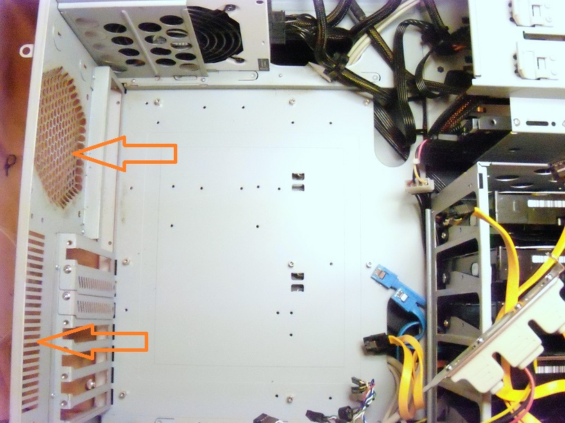 My system has two filtered intake fans on the front. There should'nt be any interior dust. The left grate is