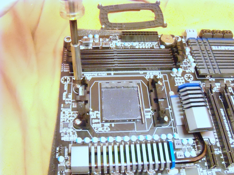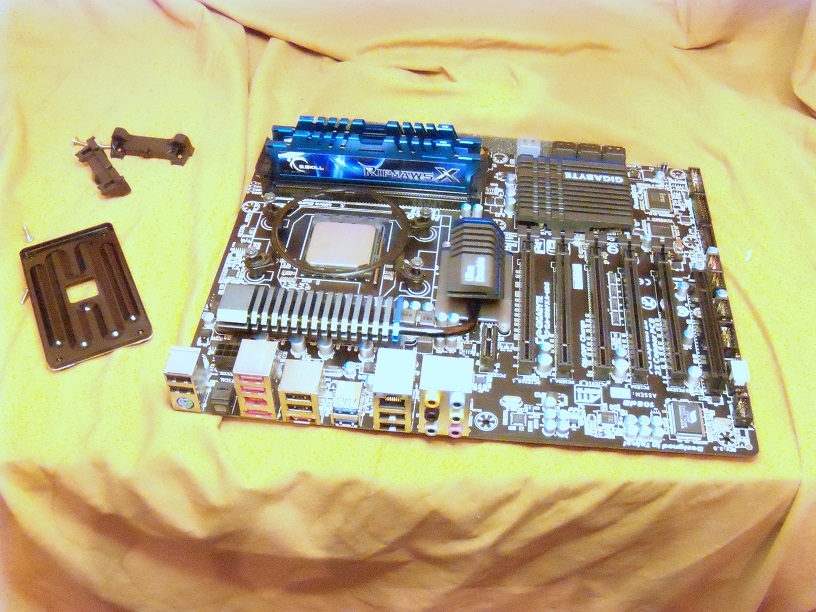 The new CPU in place and the old cooler hold downs shown to the left. The MB is on a anti-static mat and I use
