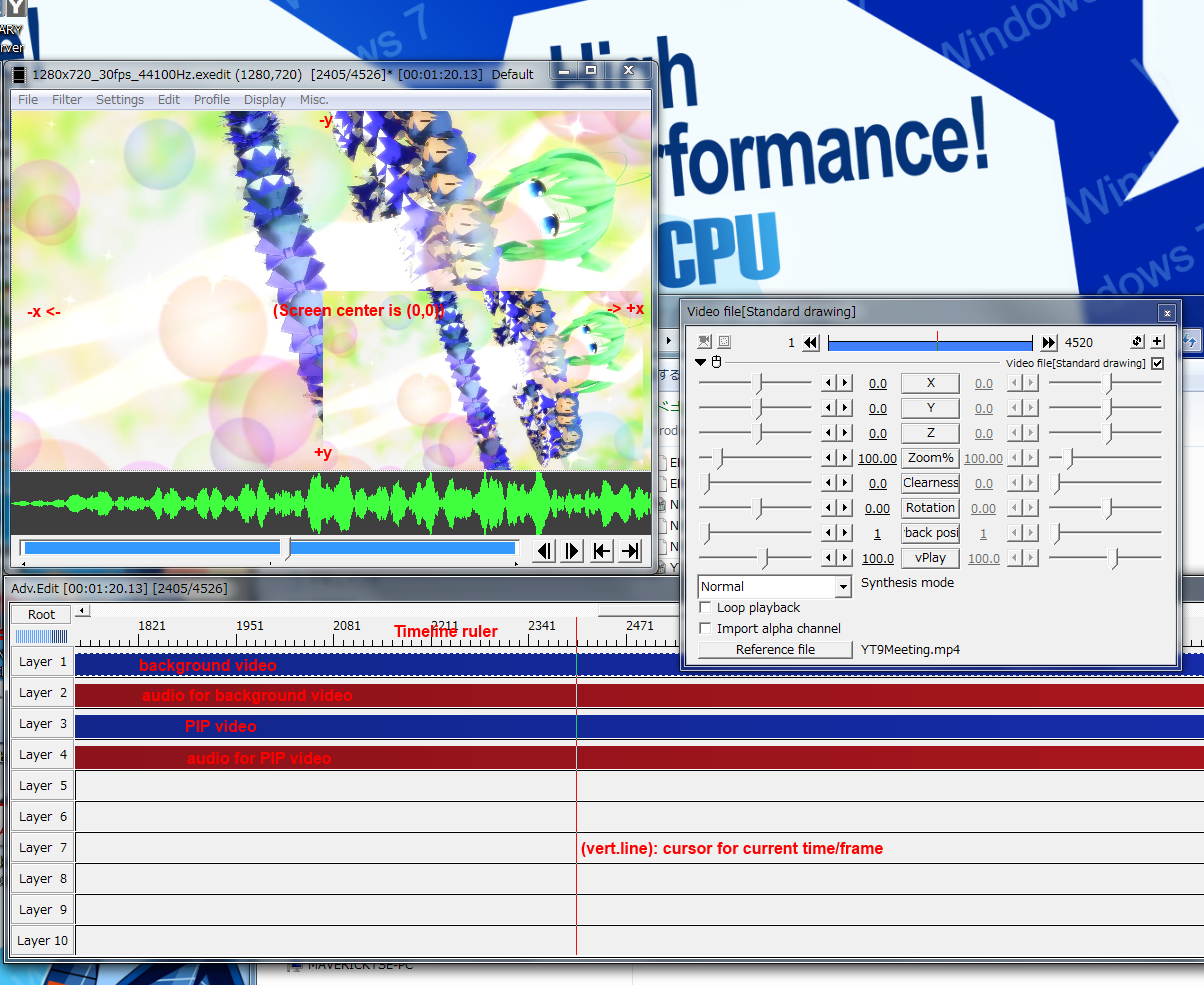 This AviUtl really is a nifty little program with lots of hidden features. What it needs is some nice video tutorials to show them. I don't have the time, so I can't do them...........