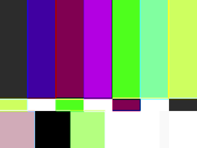 Code:ColorBars() ConvertToYUY2() Subtract(last, ConvertToRGB(last, interlaced=true, matrix="rec601").ConvertToYUY2(interlaced=true, matrix="rec601")) Levels(112,1,144,0,255)
