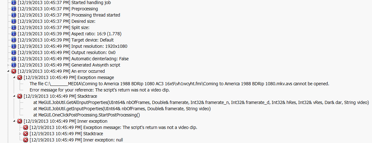 Honestly, even though I am definitely NOT a pro at this, the settings are pretty self-explanatory. I'm just wondering WHY the heck it quit. The log LOOKS like it was something to do with Avisynth, like it wasn't installed (I had also previously tried STAX and got what LOOKED like a similar error with 'Not being able to read the .avs file) but I re-installed the newest version of Avisynth, just to be sure and it did it again.