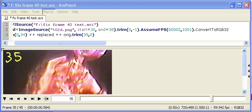 I'm using a 47 frame sequence, trying to replace frame 40. It's not cooperating, here's what I'm getting. The file is 59.94 progressive, I get the same thing when I use AssumeFPS(60000,1001) - what's the 1001 indicate?
