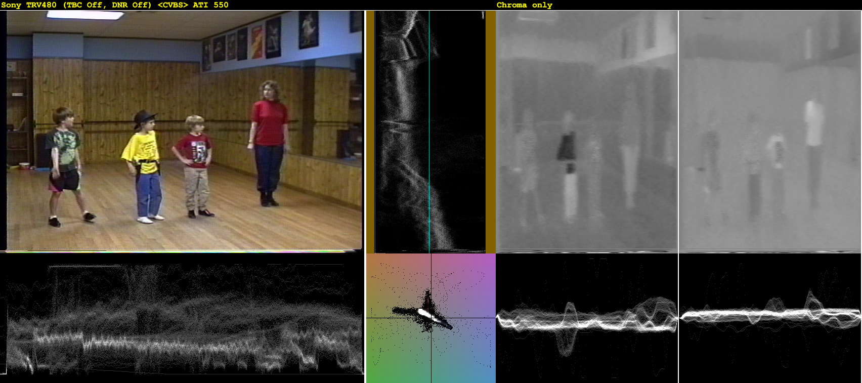 Code:V1 = AVISource("a hi8 TapPractice trv480 +tbc, DV clip2.avi",pixel_type="YUY2").ConvertToYUY2(interlaced=true).ColorYUV(off_y=0,gain_y=-25,cont_u=35,cont_v=35).AlignExplode("Sony TRV480 (TBC On)",2,2,0,1) V2 = AVISource("b hi8 TapPractice trv480 -tbc, DV clip2.avi",pixel_type="YUY2").ConvertToYUY2(interlaced=true).ColorYUV(off_y=0,gain_y=-25,cont_u=0,cont_v=0).AlignExplode("Sony TRV480 (TBC Off)",0,4,0,1) V3 = AVISource("c hi8 TapPractice trv480 -tbc-dnr, composite 550 vdub B109-C148-Sh0 clip2.avi").ColorYUV(off_y=0,gain_y=0,cont_u=-20,cont_v=-20).AlignExplode("Sony TRV480 (TBC Off, DNR Off) <CVBS> ATI 550",0,4,1,0).Trim(1,0) Interleave(V1,V2,V3) -