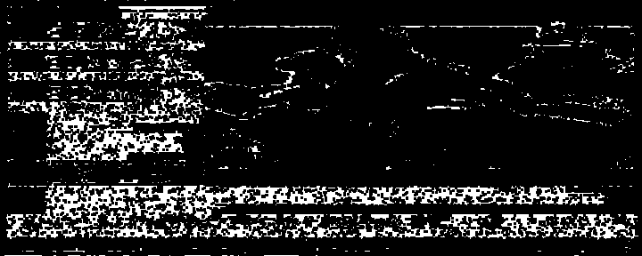 Replace return(mask) with return(edges) or return(dark) to see each individual mask.Code:s1=Mpeg2Source("D:\Downloads\_One.d2v") # build a mask SeparateFields(s1) SelectEven() edges=mt_edge(mode="0 1 0 0 -2 0 0 1 0", thy1=2, thy2=2).mt_inpand().ColorYUV(cont_u=-256, cont_v=-256) # find horizontal edges dark=mt_binarize(threshold=80, upper=true).ColorYUV(cont_u=-256, cont_v=-256) # find darkish areas Overlay(edges, dark, mode="multiply") # edges AND dark (sort of) mask=ColorYUV(cont_u=-256, cont_v=-256) # greyscale return(mask) # or edges, or dark # build a "clean" field by motion interpolating the other fields. interp=Bob(s1).SelectOdd().DoubleFPS2().SelectOdd().Loop(2,0,0).BilinearResize(s1.width, s1.height/2) # overlay even fields with the clean video via the mask SeparateFields(s1) # separate the fields odd=SelectOdd() # remember the odd fields evn=Overlay(SelectEven(), interp, mask=mask) # overlay even fields with the cleaned video via the mask Interleave(evn,odd) # evn and odd back to one stream Weave() # weave them back into interlaced frames StackHorizontal(s1, last) #compare original and cleaned video side by side -