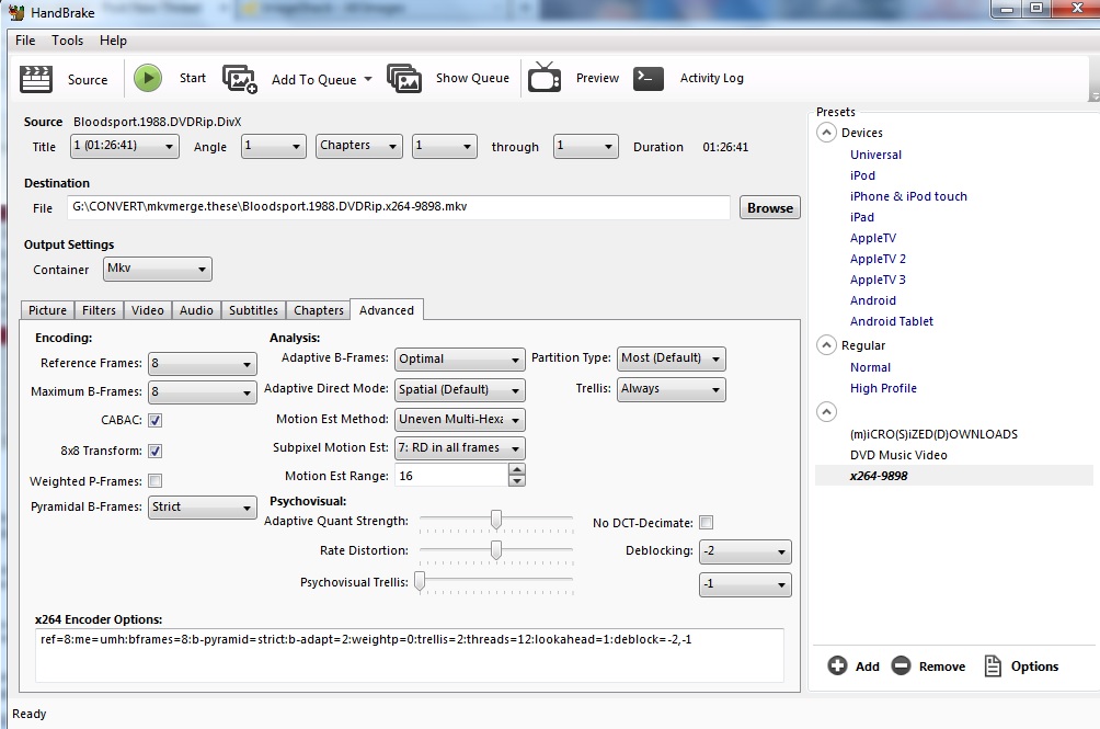 advanced settings: ref=8:me=umh:bframes=8:b-pyramid=strict:b-adapt=2:weightp=0:trellis=2:threads=12:lookahead=1 :deblock=-2,-1