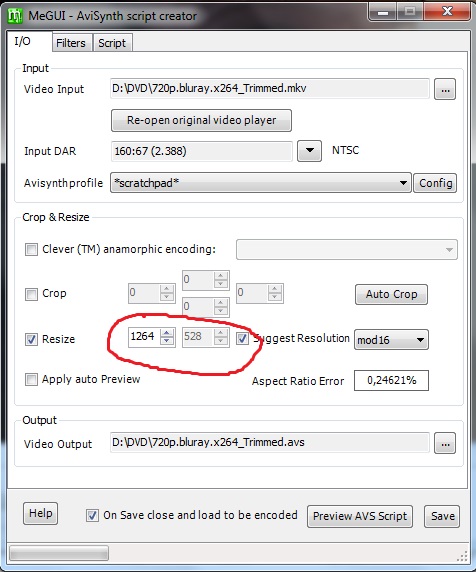 If you couldn't do it before, now MeGUI will let you resize the width back to 1280. Change the mod16 setting to something else if you like, ie mod2, which will allow MeGUI to resize the height as accurately as possible. It'll be 1280xsomething, but not 1280x544. You can adjust the cropping if need be until the aspect ratio error is quite low if you want to (I try to keep it under 0.1% myself). Whatever the new resolution, you've now resized your slightly anamorphic source video to square pixels.