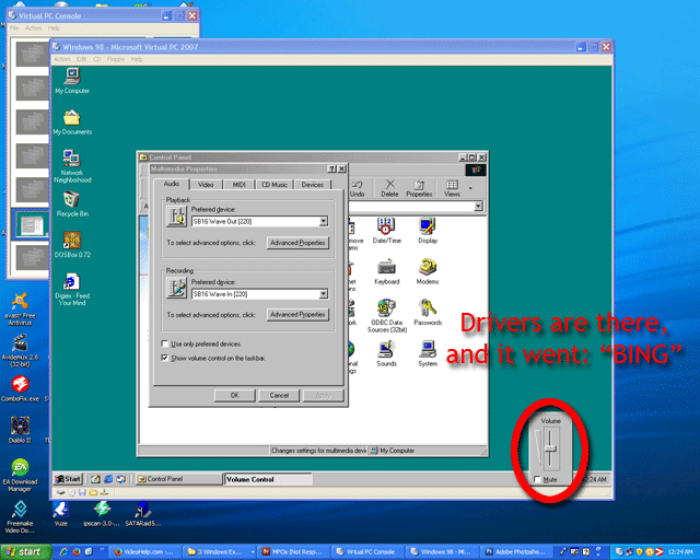 Scott and Snakebyte1: I guess on some setups the audio might work out of the box, but like I said I did install Windows 98 in VMware from a CDR in Windows 7 (on another computer, not the same one we're talking about here) and I swear it did need separate audio driver. And I even found an Internet thread/article where people were needing this, and this guy had posted a tutorial, saying how this generic driver should work for everybody needing it, and it did work, so yeah in some cases even in VM W98 does not install 100% usable out of the box. I swear I'm not lying, and it did happen to me (not a friend or other people on the Internet). I found it very interesting to see that you guys were right also, though. Two sides to every story.