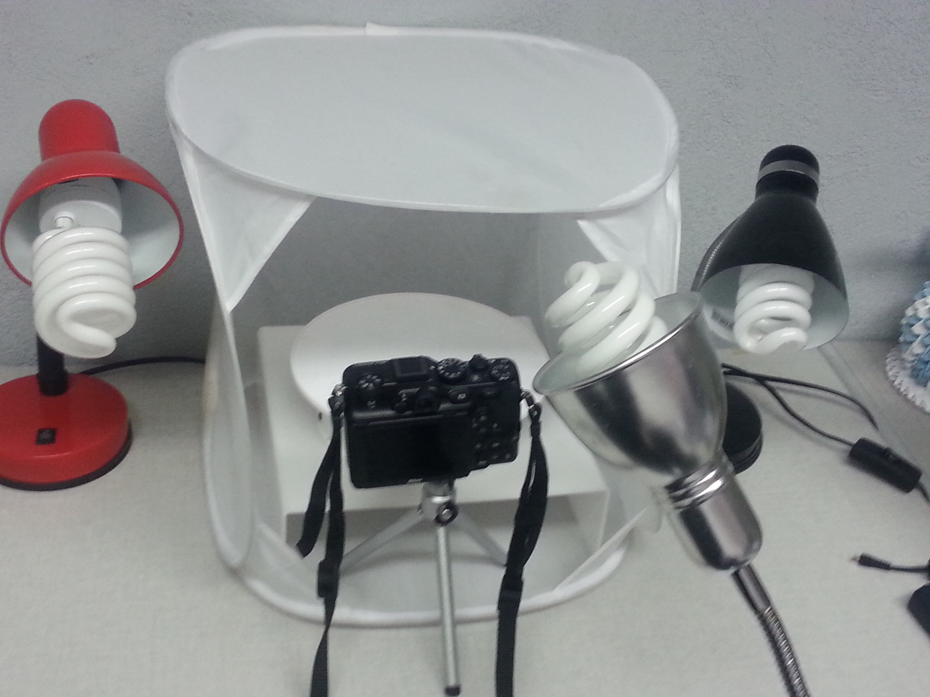 I am using a nikon coolpix p7100 in addition a filming tent and 3 fluorescent lights (all daylight bulbs)