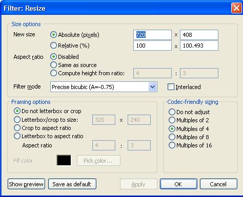 I am using resize filter where i changed values after ur help according to mod 4. Current setting is 720 * 408.