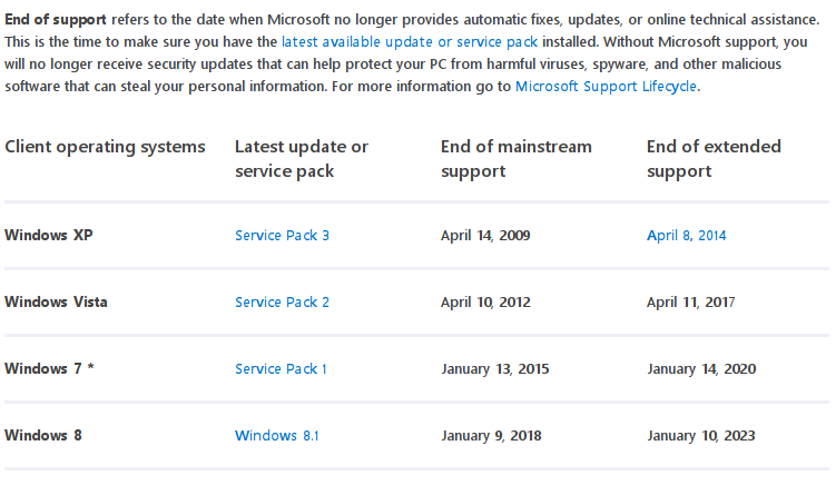 End of support refers to the date when Microsoft no longer provides automatic fixes, updates, or online technical assistance. This is the time to make sure you have the latest available update or service pack installed. Without Microsoft support, you will no longer receive security updates that can help protect your PC from harmful viruses, spyware, and other malicious software that can steal your personal information. For more information go to Microsoft Support Lifecycle.