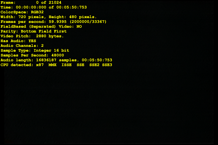 Info: AviSynth - 0 kbps - 720x480 - DAR 1.5 - 29.97 fps (CFR) - 5:50 minutes - 10513 frames