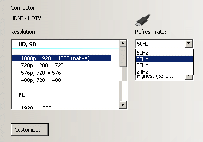 I'm using XP so I can't choose between 59.940Hz and 60Hz. I believe later versions of Windows allow you to. I generally leave my TV at 50Hz while using ReClock to play everything at 25fps, which gives me a kind of "PAL film mode". Plus I also have a reasonable amount of interlaced PAL, or 50fps video, but very little interlaced or 29.970 progressive video etc. According to Reclock, when I connect to the TV at 50Hz it's actually connected at 50.002Hz. 60Hz is really 60.002Hz, 25Hz is really 25.001Hz and 24Hz is really 23.951Hz. The timings never seem to be exactly what they should be.