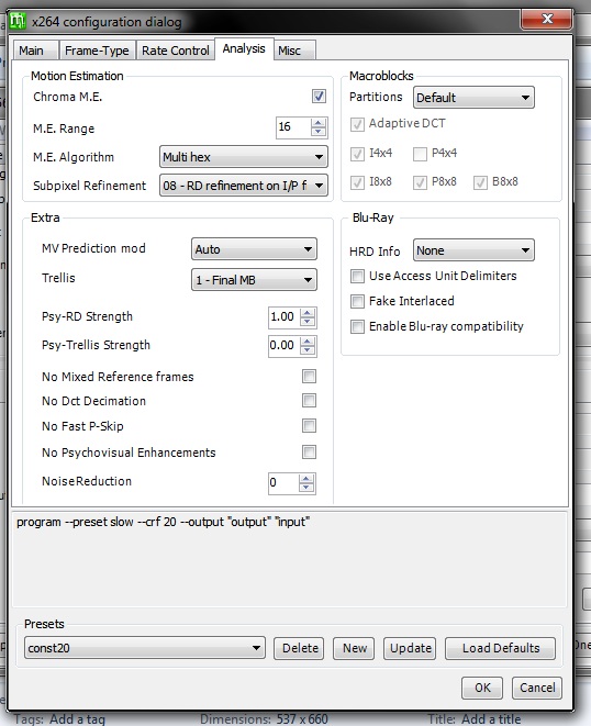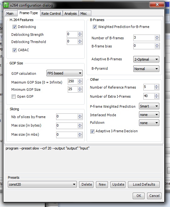 Encoding settings : cabac=1 / ref=5 / deblock=1:0:0 / analyse=0x3:0x113 / me=umh / subme=8 / psy=1 / psy_rd=1.00:0.00 / mixed_ref=1 / me_range=16 / chroma_me=1 / trellis=1 / 8x8dct=1 / cqm=0 / deadzone=21,11 / fast_pskip=1 / chroma_qp_offset=-2 / threads=6 / lookahead_threads=1 / sliced_threads=0 / nr=0 / decimate=1 / interlaced=0 / bluray_compat=0 / constrained_intra=0 / bframes=3 / b_pyramid=2 / b_adapt=2 / b_bias=0 / direct=3 / weightb=1 / open_gop=0 / weightp=2 / keyint=300 / keyint_min=29 / scenecut=40 / intra_refresh=0 / rc_lookahead=50 / rc=crf / mbtree=1 / crf=20.0 / qcomp=0.60 / qpmin=0 / qpmax=69 / qpstep=4 / ip_ratio=1.40 / aq=1:1.00