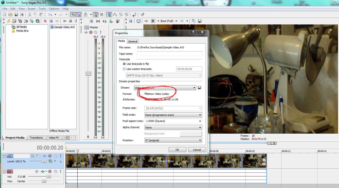 6. Vegas loaded that video through ffdshow, so you install it and it might be alright to edit, but it needed to be interpreted as progressive, Vegas thinks it is interlace, so in that open window that you can see on picture, select Field Order - "none":