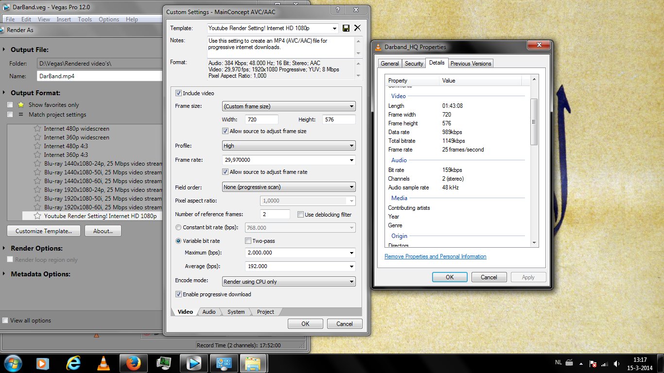 Right now I am only trying to experiment and learn step by step about how to render any kind of video on Vegas so I can go on and actually create some video's in the future. Creating them is right now much easier because of my experience with Acid. only the rendering part is a pain the tail..aspect ratio, bitrate, fps etc, it has been a really confusing week or two. Especially having to wait for hours for the rendering to finish, just to find out that the quality is bad or that the logo/object is not in the right place while it was all OK in the preview window!
