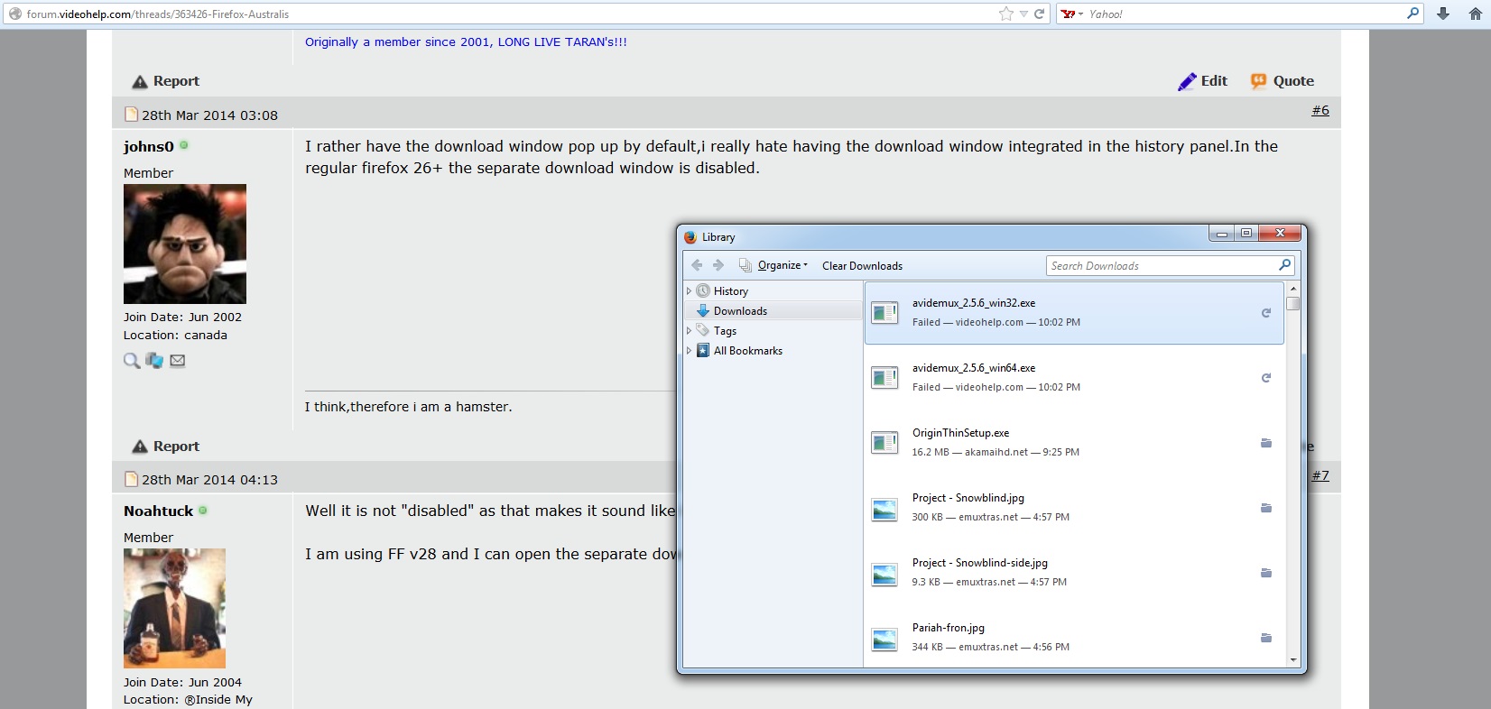 I rather have the download window pop up by default,i really hate having the download window integrated in the history panel.In the regular firefox 26+ the separate download window is disabled. I think,therefore i am a hamster.