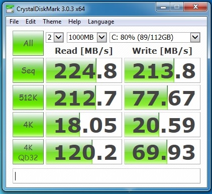 I'm using a laptop, in bay 1, I have a 120GB SSD Samsung drive connected with SATA III. Currently has 23GB of space free of the 111GB of formatted space. This is the specific drive: http://www.amazon.com/gp/product/B00E3W15P0/ref=oh_details_o05_s00_i00?ie=UTF8&psc=1. The crystaldiskmark picture is attached below.