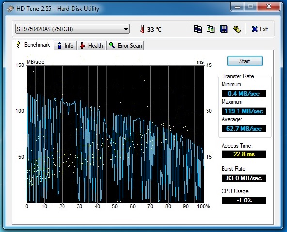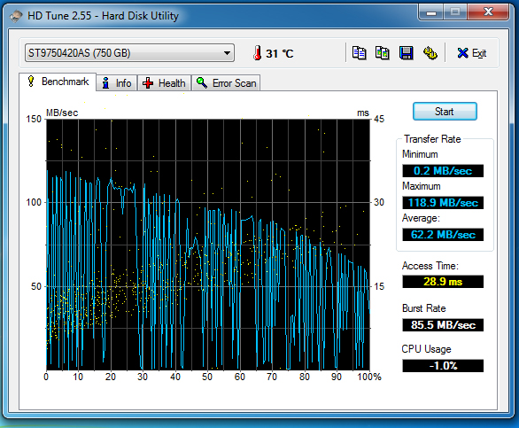 Ok here are the results of the test with the 750GB platter hard drive (the one I predict is failing) in the main slot of the laptop (not in the optical drive bay, but rather in its OEM location). As you can see the results are almost exactly the same as before.