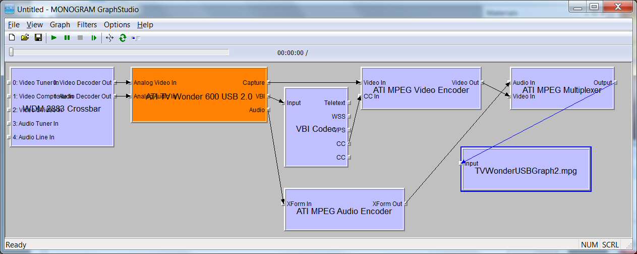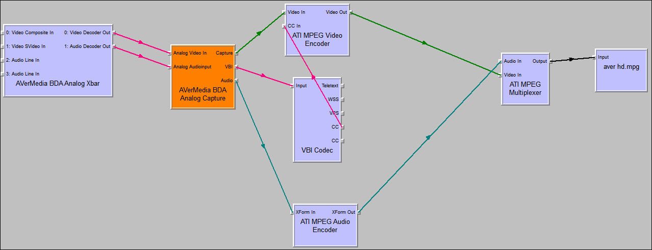 I am glad to hear Graphedit worked. Basically it allows you access to the drivers provided for a capture device/TV tuner, plus various other WDM filters for video and audio that are installed in your system by Windows or something else. Making a working graph sometimes takes a lot of trial and error. Some filters are compatible and some aren't. Write down the settings you used for the properties. You may have to re-enter the properties for the capture filter, encoders and multiplexer again because they may not be saved with the graph, or they can be changed when using other capture or video player software.