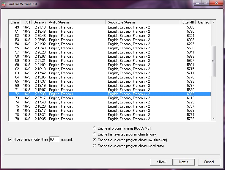 I was attempting to rip one of my kids DVD's in so I could drop a bunch of them on a memory stick for traveling. When I got to the screen to select the chain that I wished to encode, there were about 40 of them, all over 2 hours long with different audio tracks and such.