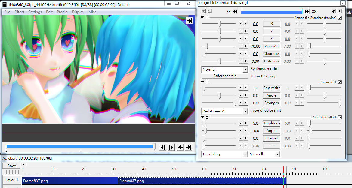 1) The green/magenta effect is done with RGB splitting (each plane is shifted in a direction) .