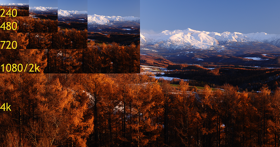 All images are taken from a master 6k/8k still and sized down then blown up to equivalent frame sizes, using the same downrez algorithm and the same uprez algorithm. What you are seeing is a (~200%?) blown up section from the center of the 4k screen - just to the right of the 1080 overlay.