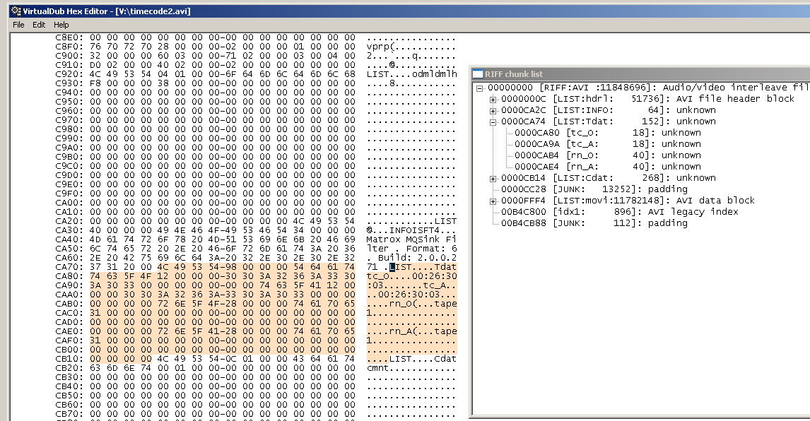 I have see in another case (ffmpeg, matrox digisuite .avi files ecc..) timecode code in "envelope" in the header of the .avi, I thought that somehow, using hex editor you could (in an automated way then) enter the timecode but now I have lost hope