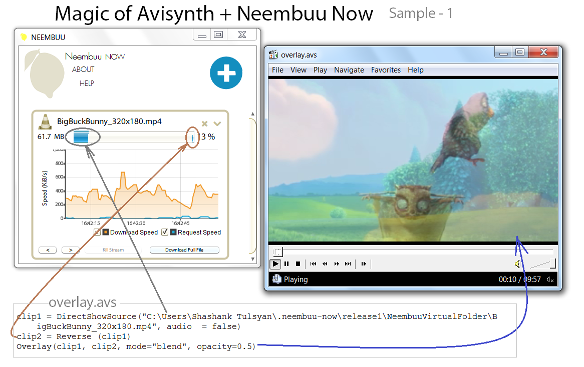 The video is downloaded and post-processed at the same time.Code:clip1 = DirectShowSource("C:\Users\Shashank Tulsyan\.neembuu-now\release1\NeembuuVirtualFolder\BigBuckBunny_320x180.mp4", audio = false) clip2 = Reverse (clip1) Overlay(clip1, clip2, mode="blend", opacity=0.5)