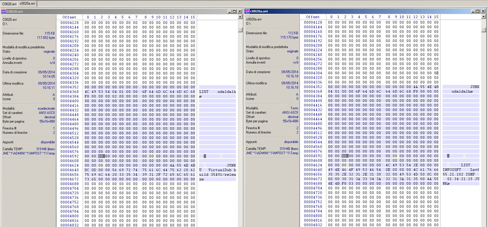 my nle, strangely, don't read well the c0020a.avi generated from ffmpeg (maybe is the new header or I don't) meanwhile it read perfetly files generated from virtualdub (c0020.avi)