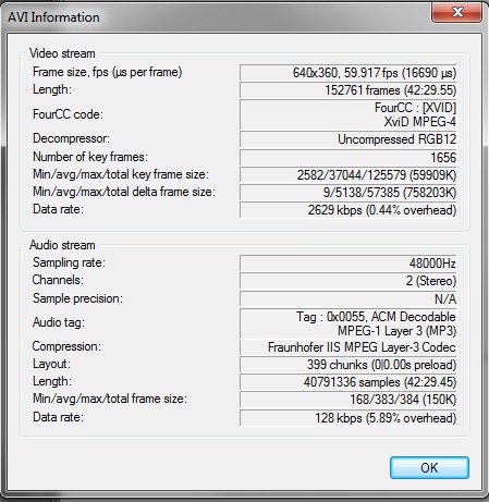 I'm wondering why the Frame Rate changed when the video was placed in it's own AVI. The video is 42:29, not 43:57, otherwise the original AVI would have had a duration of 43:57.