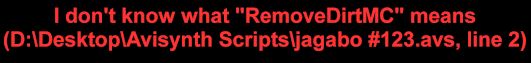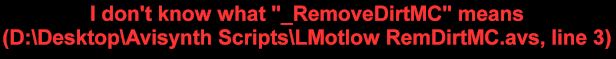 True, and thanx to johnmeyer for clarifying the function issue. Yes, the version of RemoveDirtMC used by john is in his script. So there's no need to import the function, period. Looks like the "RemoveDirt" errors came from the fact that the O.P. changed the name of his Avisynth folder from 2.5 to 2.6. No wonder the system couldn't find all the plugins.