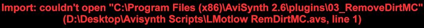 Asjust the path statement to match the location of Avisynth plugins in your system. On the PC I'm using right now, my AVisynth folder isn't in my Program Files folder but is on my D: drive in its own folder. So I would have to type that import statement as:Code:Import("drive:\path\Avisynth 2.5\plugins\03_RemoveDirtMC.avs") ### <<<- adjust drive and path to match your system AviSource("d:\desktop\1986-test 1e.avi") 03_RemoveDirtMC(last, 55, false)
